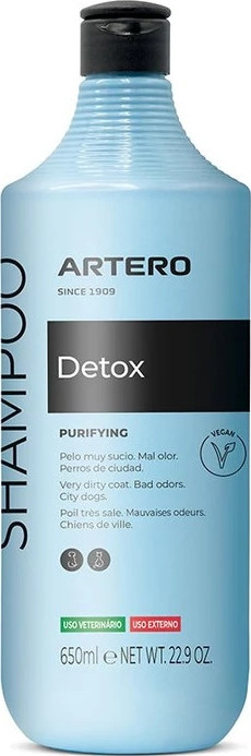 Az ARTERO DETOX KUTYA SAMPON rendkívül erős tisztítóhatású, szennyezésmentesítő és egyidejűleg méregteleníti az állat szőrzetét. Zsírtalanító és méregtelenítő hatása miatt nagyon ajánlott a nagyvárosi kutyák ápolásához. Hosszú távra megakadályozza a környezet és a levegő, szennyező részecskéinek megtapadását a szőrszálakon. Ez a tulajdonság párosul a jó hidratáló hatással így lehetővé teszi a kutya hosszabb időközönkénti fürdetését.