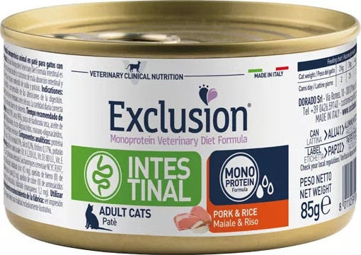 Az Exclusion Diet Intestinal egy teljes értékű diétás macskaeledel, amelyet a bél akut felszívódási zavarainak csökkentésére és a bélrendszeri emésztési zavarok kompenzálására állítottak össze. Ez a teljes értékű diétás eledel megnövelt elektrolit-szintet, jól emészthető összetevőket és alacsony zsírtartalmat tartalmaz.
