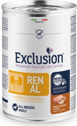 Az Exclusion Diet Renal Pork and Sorghum and Rice felnőtt ebek részére készült teljes, dietetikus élelem, veseműködés serkentő hatású krónikus vagy időszakos veseelégtelenség esetén.