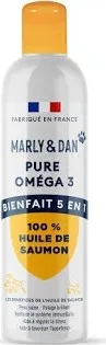 A Marly & Dan Salmon Oil Pure Omega-3 for Dog & Cat 250 ml egy prémium minőségű, természetes lazacolaj kutyák és macskák számára. Az Omega-3 zsírsavakban gazdag formula hozzájárulhat a bőr egészségéhez, a fényes szőrzethez, az immunrendszer támogatásához és az ízületek megfelelő működéséhez, miközben ízletesebbé teszi a mindennapi eledelt. A Marly & Dan lazacolaj tiszta lazacból készült táplálékkiegészítő, amely természetes Omega-3 és Omega-6 zsírsavakat tartalmaz. Ezek az esszenciális zsírsavak fontos szerepet játszanak a kutyák és macskák egészségében, különösen a bőr és szőrzet állapotának javításában és az általános vitalitás fenntartásában.