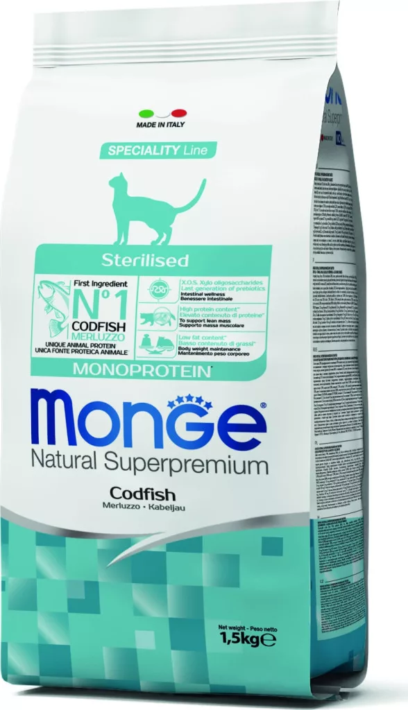 Az alacsony zsírtartalomnak és a magas fehérjetartalomnak köszönhetően a sterilizált macskák egészségét szolgálja. Segít fenntartani az ideális testtömeget és a megfelelő testalkatot. A termék xylo-oligoszacharideket és probiotikumokat tartalmaz a megfelelő emésztés céljából. A kiválasztott összetevőknek köszönhetően, mint például a csipkebogyó és a yucca schidigera, támogatja az immunrendszert és csökkenti a széklet kellemetlen szagát. Nem tartalmaz színezőanyagot és mesterséges tartósítószert.